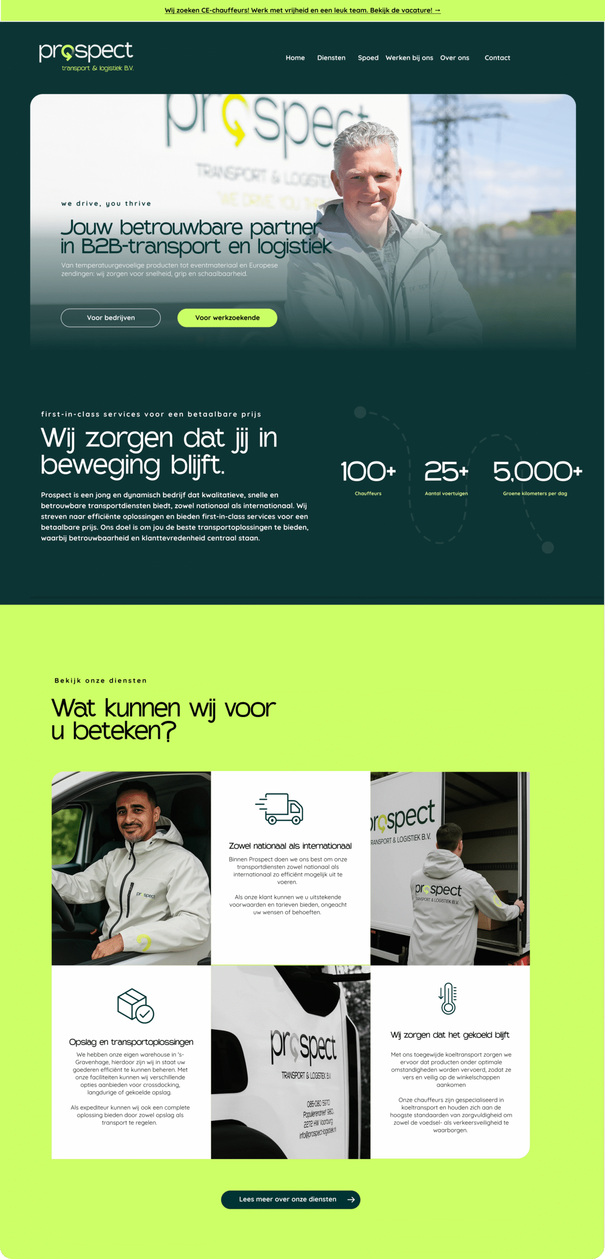 Toen we voor het eerst in aanraking kwamen met Prospect Logistiek, viel één ding direct op: de online uitstraling deed geen recht aan de omvang en kwaliteit van het bedrijf. Dit is een organisatie met meer dan honderd chauffeurs, indrukwekkende B2B-klanten en een sterke reputatie in geconditioneerd transport.