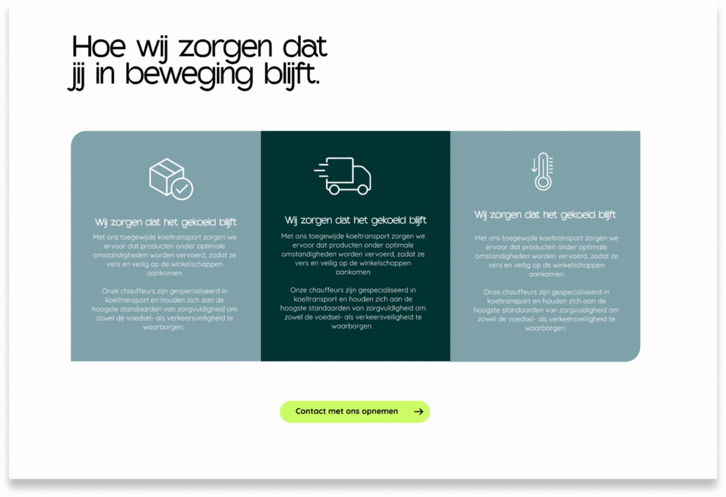 De merkidentiteit moest volledig opnieuw gedefinieerd worden. Niet langer chauffeur-gericht, maar een krachtige B2B-propositie waarin betrouwbaarheid, schaalbaarheid en sectorspecifieke expertise centraal staan. - Heldere formulering van diensten